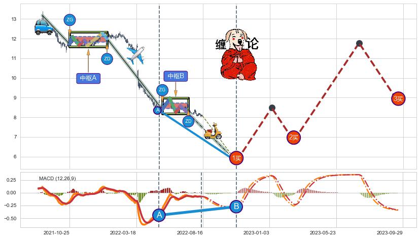 ➣ 【中枢B】:2022-05-19-2022-07-15,中枢由5笔构成,共40交易日, ZG=8.58, ZD=8.39