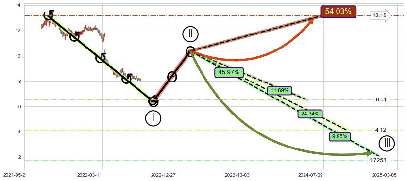 ➣ 5.1: 预测当前第5浪位置(2022-08-10, 8.06),仍然有下跌空间