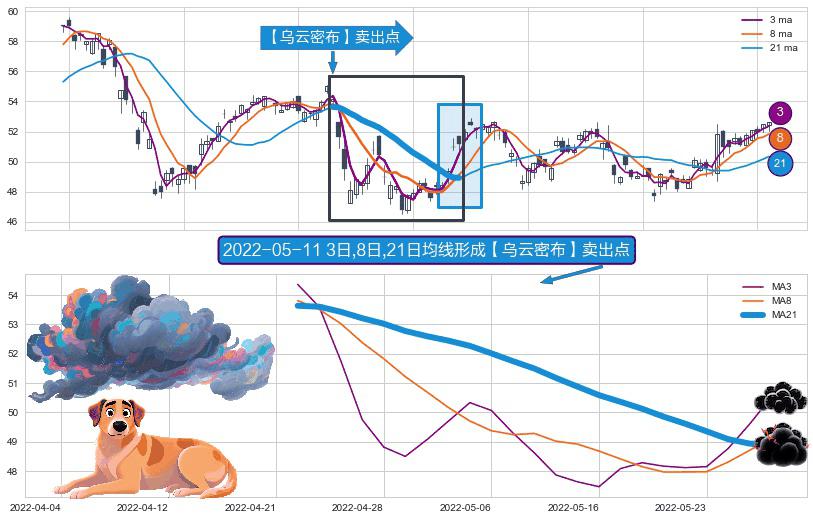 ⚀ 2022-04-22日-2022-05-26日显现 3日-8日-21日均线 【乌云密布】卖出点 看空信号,后市看跌,卖出