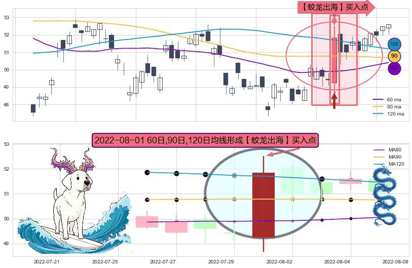 ⚀ 2022-08-01日显现 60日-90日-120日均线 【蛟龙出海】买入点 看多信号,后市看涨,买入