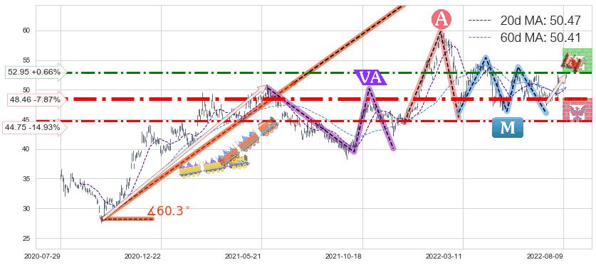 ♘ 支撑价格位48.46,可信任强度88.55%,距离最后交易2022-08-12形成的收盘价格52.60相差 -7.87%