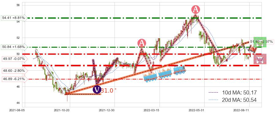 ♘ 阻力价格位50.84,可信任强度62.05%,距离最后交易2022-08-12形成的收盘价格50.00相差 +1.68%