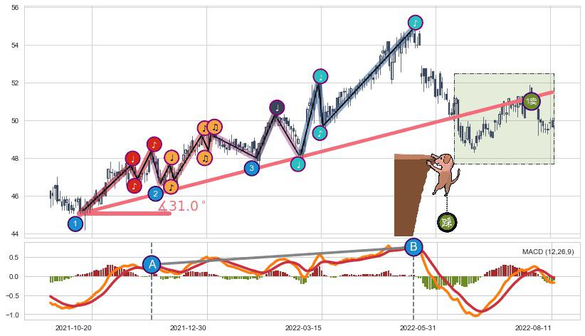 从2021-10-11至2022-05-24,共包含151个交易日,阶段股价上涨15.63%,阶段股价变动位移路程比: 1 : 6,上涨趋势角度: 31.0