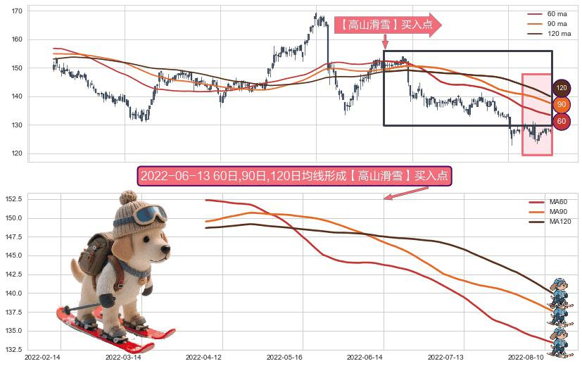 形态多维评估: ⚀ 2022-04-06日-2022-08-12日显现 60日-90日-120日均线 【高山滑雪】买入点 看多信号,后市看涨,买入