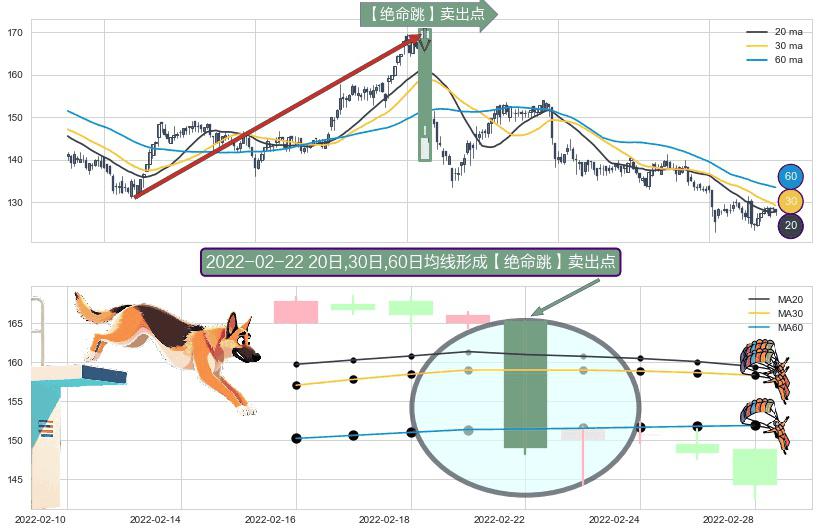 形态多维评估: ⚀ 2022-02-22日显现 20日-30日-60日均线 【绝命跳】卖出点 看空信号,后市看跌,卖出