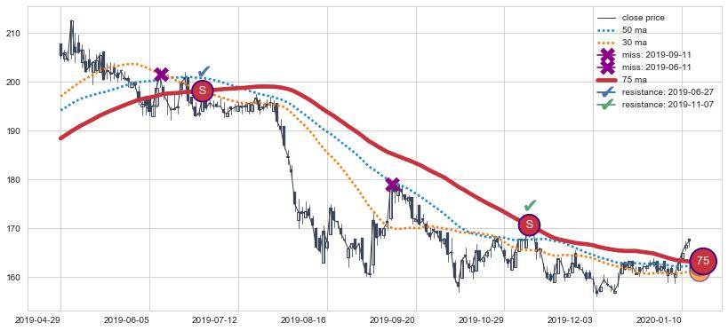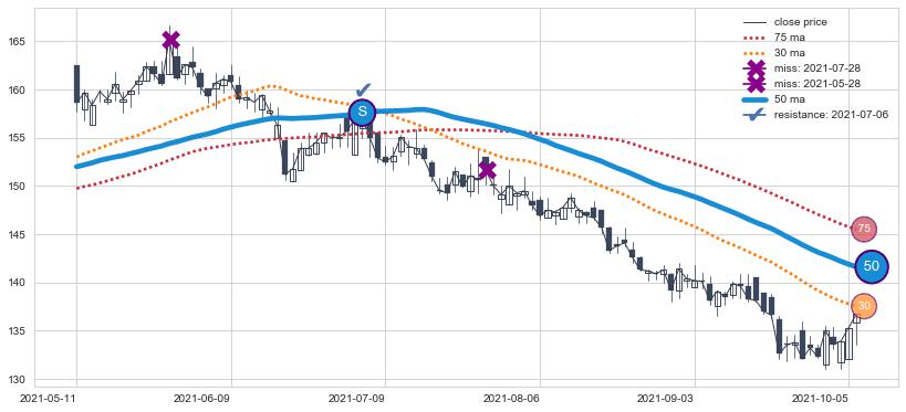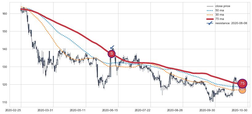 下跌趋势2022-02-21-2022-08-12,均线50, 75, 30确认关键阻力4处