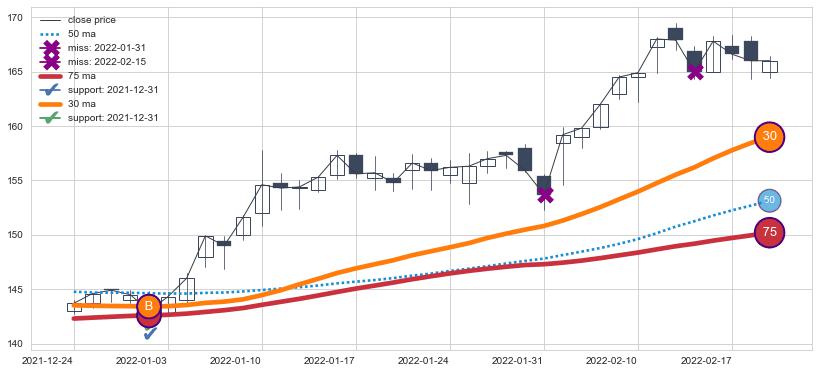 上涨趋势2021-12-24-2022-02-21,均线75, 30确认关键支撑1处