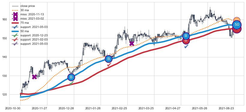 上涨趋势2020-10-30-2021-06-23,均线50, 75确认关键支撑3处