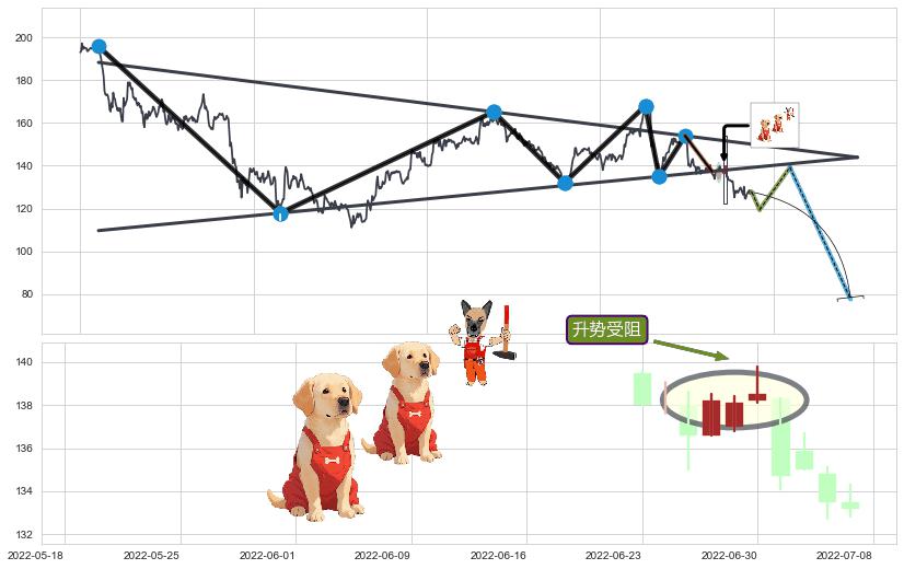 | 8 🅚:塔形顶 | 圆顶 ➕ 📐:下降对称三角整理下行突破支撑位破位, 猜想持续下沉下跌,被突破的支撑位已变为阻力位 ☞ 看空信号 ⇥ 【🅚线】交织【图形】⇥ 综合量化分数: 41 | > |