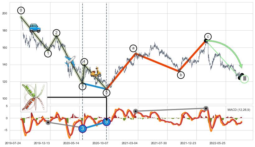 ➣ a,c调整浪MACD, RSI, KDJ走势都【未出现】背离,abc走势延续, 5浪反转概率增强
