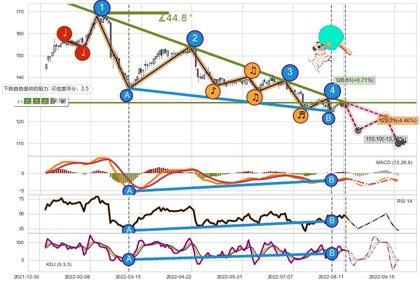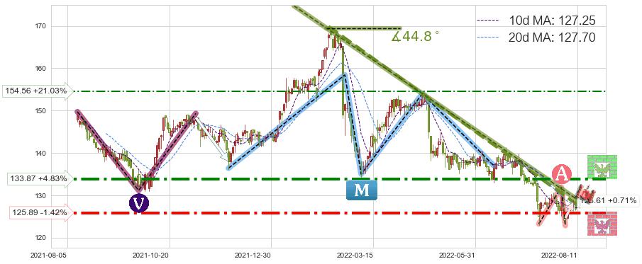 ♘ 阻力价格位133.87,可信任强度80.28%,距离最后交易2022-08-12形成的收盘价格127.70相差 +4.83%