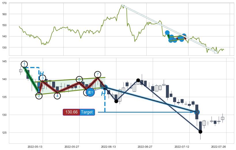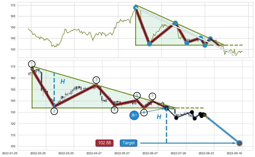 ➢ 【多方力量耗尽,空方打破攻守平衡点】下降三角形中继整理, 已在2022-07-06突破【支撑】颈线 133.80 →演变成下降通道
