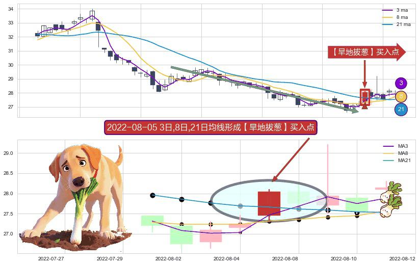 形态多维评估: ⚀ 2022-08-05日显现 3日-8日-21日均线 【旱地拔葱】买入点 看多信号,后市看涨,买入