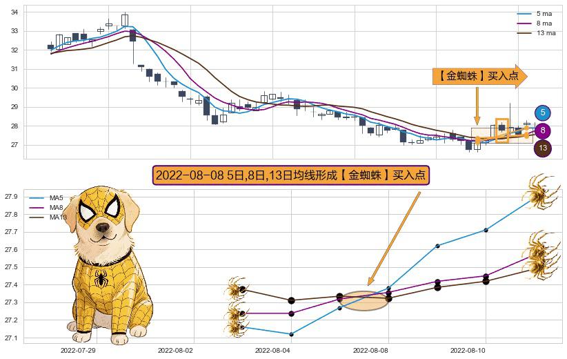 形态多维评估: ⚀ 2022-08-08日显现 5日-8日-13日均线 【金蜘蛛】买入点 看多信号,后市看涨,买入