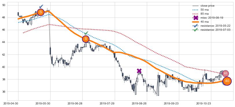下跌趋势2019-04-30-2019-11-01,均线40确认关键阻力2处