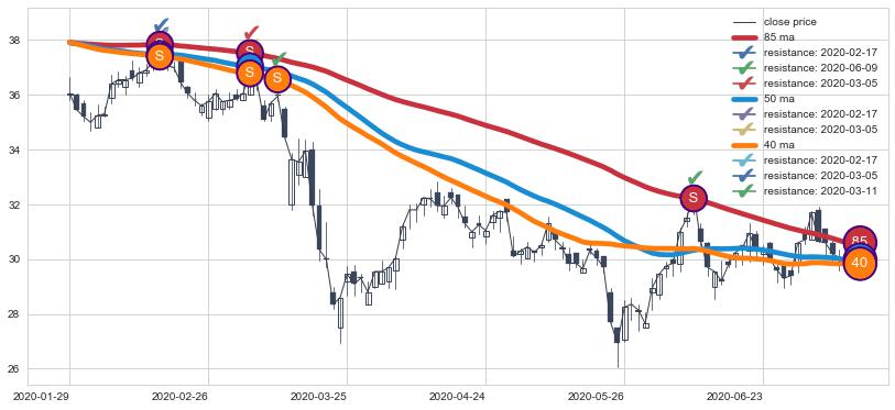 下跌趋势2020-01-29-2020-07-13,均线40, 50, 85确认关键阻力4处
