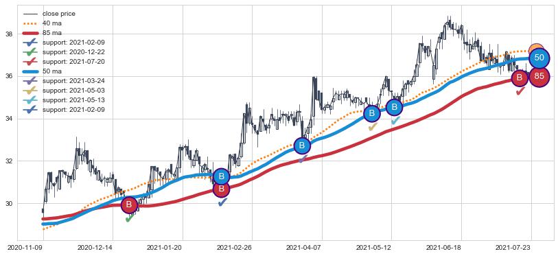 上涨趋势2020-11-09-2021-07-23,均线50, 85确认关键支撑6处