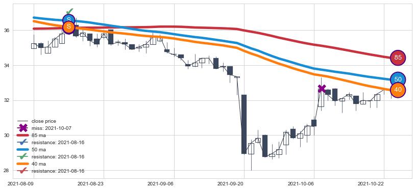下跌趋势2021-08-09-2021-10-25,均线40, 50, 85确认关键阻力1处