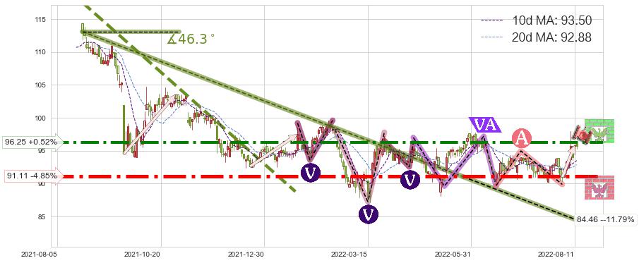 ♘ 支撑价格位91.11,可信任强度93.33%,距离最后交易2022-08-12形成的收盘价格95.75相差 -4.85%