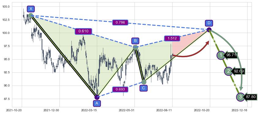 ➣ 未完成【伽利】形态起点X: 2021-11-05, 已到达C点: 2022-06-17, 预测最终D点: 2022-10-19, 共237交易日