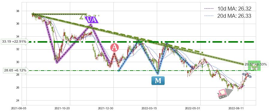 ♘ 阻力价格位28.65,可信任强度54.50%,距离最后交易2022-08-12形成的收盘价格27.00相差 +6.12%