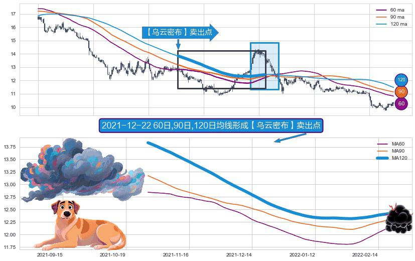 ⚀ 2021-10-28日-2022-02-21日显现 60日-90日-120日均线 【乌云密布】卖出点 看空信号,后市看跌,卖出