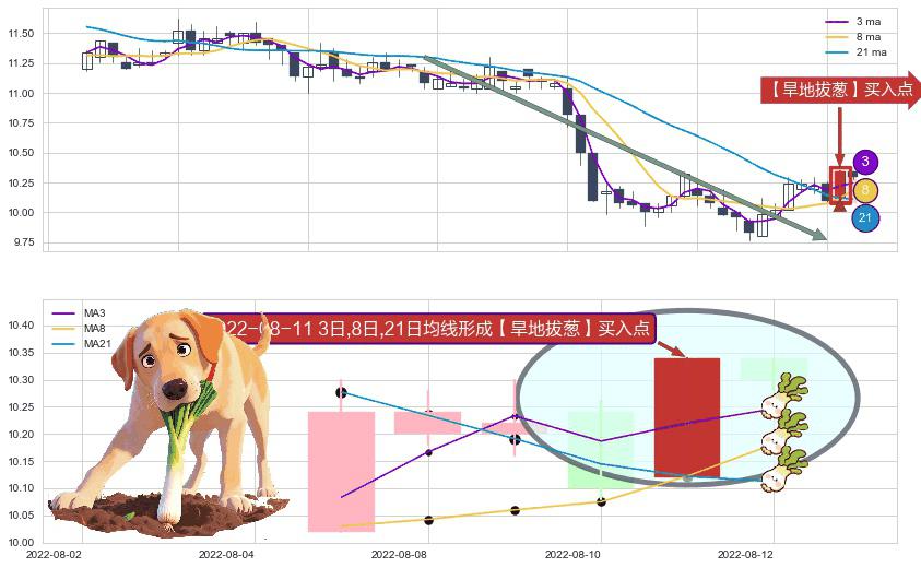 ⚀ 2022-08-11日显现 3日-8日-21日均线 【旱地拔葱】买入点 看多信号,后市看涨,买入