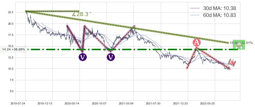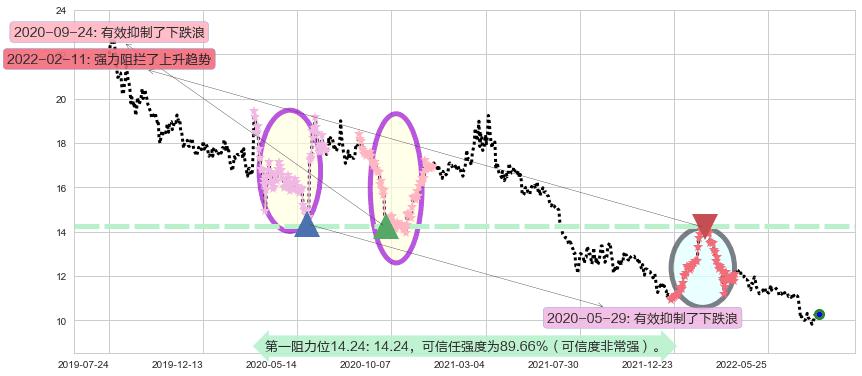 ♘ 阻力价格位14.24,可信任强度89.66%,距离最后交易2022-08-12形成的收盘价格10.30相差 +38.28%