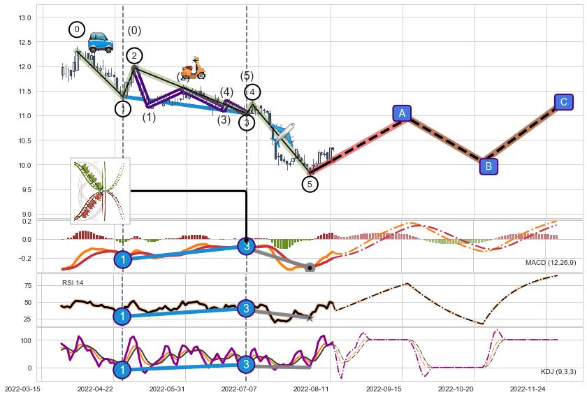 ➢ 1,3,5驱动浪MACD, RSI, KDJ走势都出现【常规背离】反转信号增强