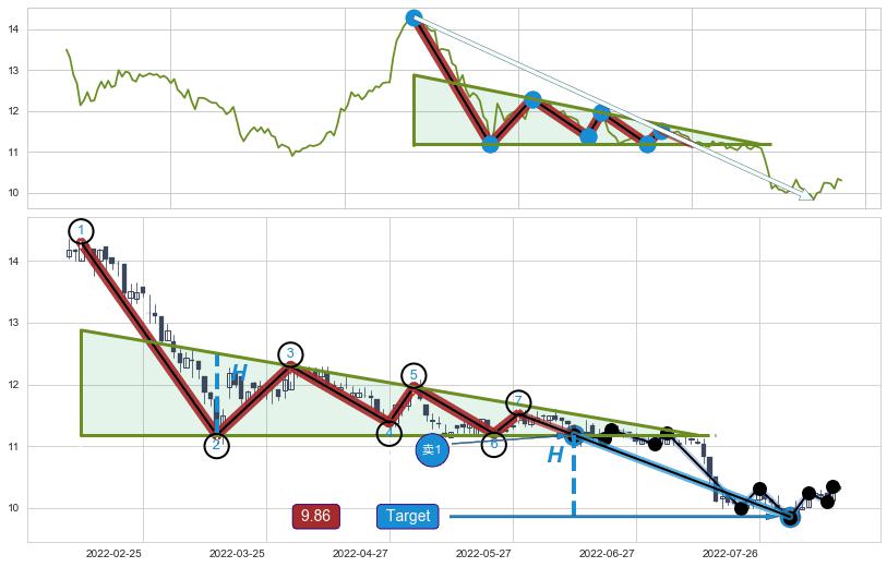 ➢ 【多方力量耗尽,空方打破攻守平衡点】下降三角形中继整理, 已在2022-06-13突破【支撑】颈线 11.18 →演变成下降通道
