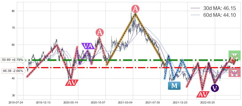 ♘ 支撑价格位46.38,可信任强度80.69%,距离最后交易2022-08-12形成的收盘价格47.65相差 -2.66%