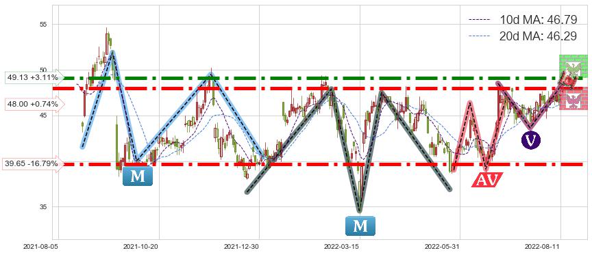 ♘ 阻力价格位49.13,可信任强度89.42%,距离最后交易2022-08-12形成的收盘价格47.65相差 +3.11%