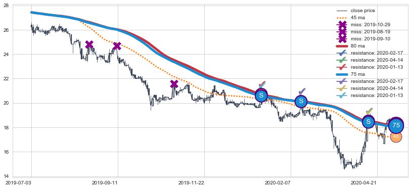 下跌趋势2019-07-03-2020-05-04,均线80, 75确认关键阻力3处
