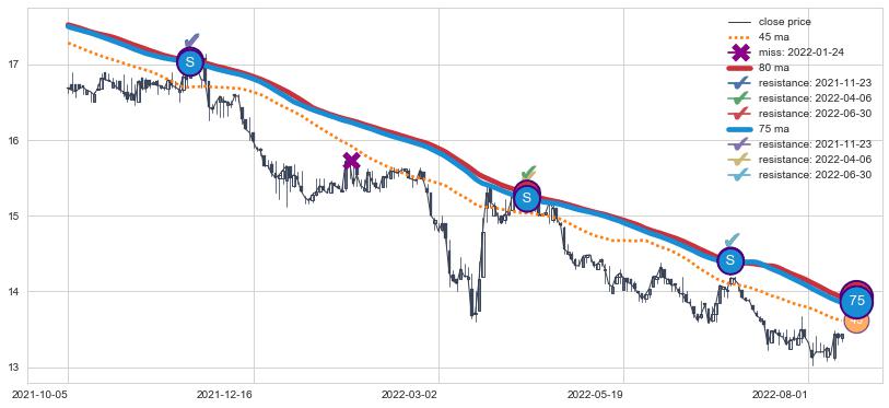 下跌趋势2021-10-05-2022-08-12,均线80, 75确认关键阻力3处