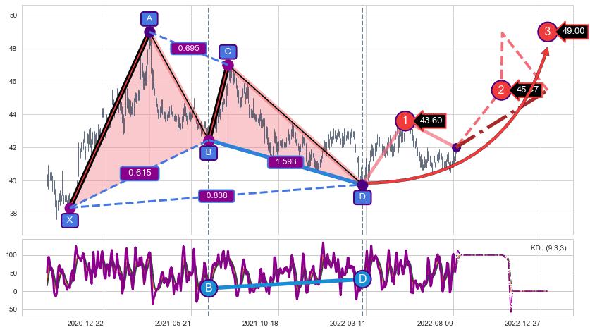 ➢ 谐波价格D点比B点低 ⤵,【KDJ】指标D点比B点高 ⤴️