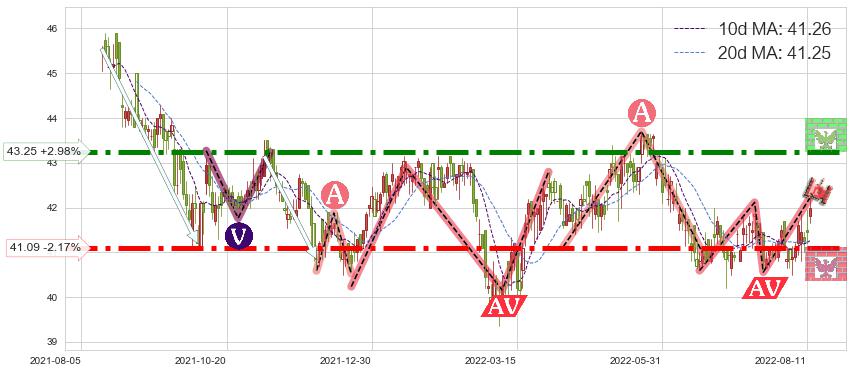 ♘ 阻力价格位43.25,可信任强度94.04%,距离最后交易2022-08-12形成的收盘价格42.00相差 +2.98%