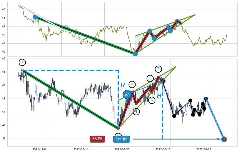 ➢ 高点影线(2022-05-30: 43.25 )→回踩→第二根k线高点(2022-05-27: 43.05 )