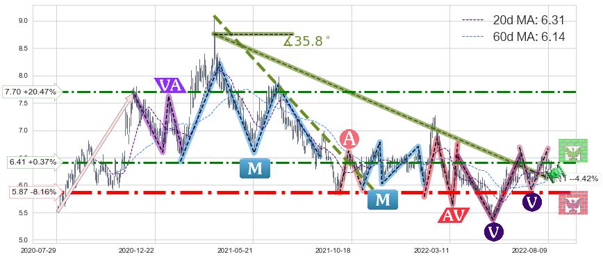 ♘ 阻力价格位6.41,可信任强度62.53%,距离最后交易2022-08-12形成的收盘价格6.39相差 +0.37%