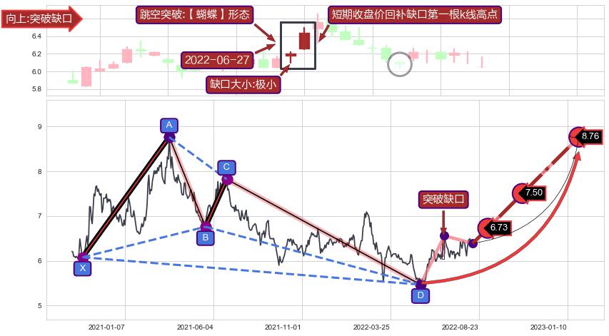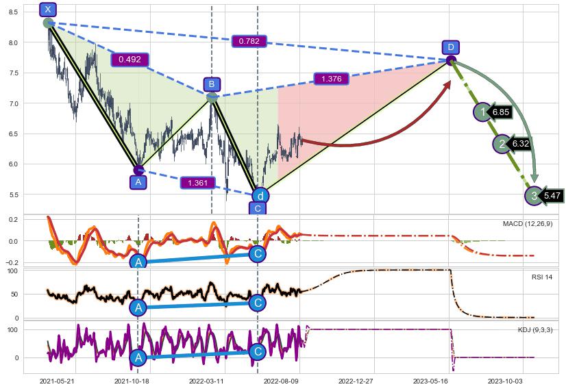 ➣ D点拟合预测价格7.70,距离最后交易收盘价格6.39相差 +20.48%
