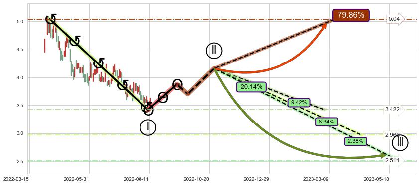 ➢ 循环浪继续向下【最高】位置(2023-03-03, 3.422),匹配聚类样本比例46.79%, 可能性概率9.42%