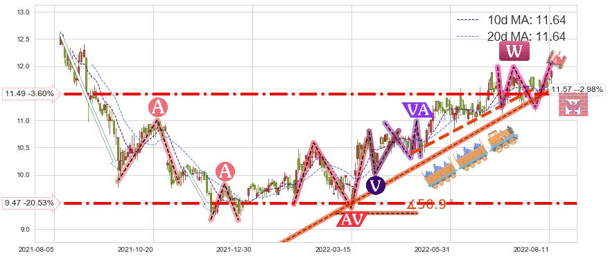 ♘ 支撑价格位9.47,可信任强度82.62%,距离最后交易2022-08-12形成的收盘价格11.92相差 -20.53%