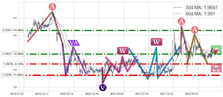 ♘ 支撑价格位1.7376,可信任强度98.39%,距离最后交易2022-08-12形成的收盘价格1.9700相差 -11.80%