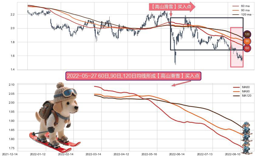 形态多维评估: ⚀ 2022-03-07日-2022-08-12日显现 60日-90日-120日均线 【高山滑雪】买入点 看多信号,后市看涨,买入