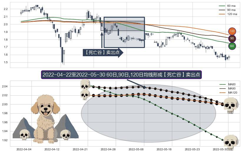 形态多维评估: ⚀ 2022-04-25-日至2022-05-30-日显现 60日-90日-120日均线 【死亡谷】卖出点 看空信号,后市看跌,卖出