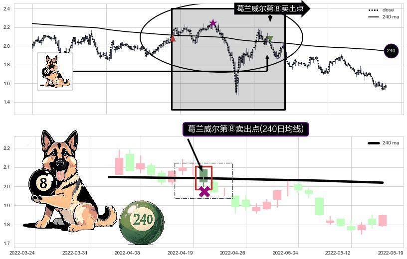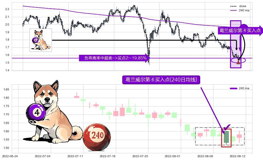 形态多维评估: ⚀ 2022-08-10-日显现 葛兰威尔均线 240日均线 第④买入点 下降趋势均值回复的短线反弹信号,后市看涨,买进信号