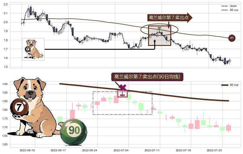 形态多维评估: ⚀ 2022-06-30-日显现 葛兰威尔均线 90日均线 第⑦卖出点 下降趋势的中继信号,后市看跌,卖出信号