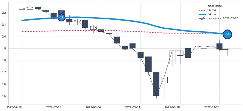下跌趋势2022-02-18-2022-03-28,均线34确认关键阻力1处