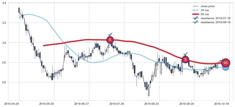 下跌趋势2019-04-29-2019-10-16,均线95确认关键阻力2处
