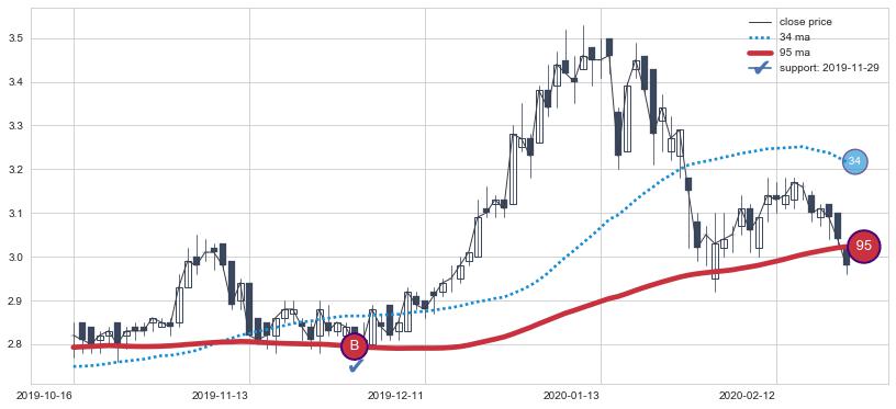 上涨趋势2019-10-16-2020-02-24,均线95确认关键支撑1处