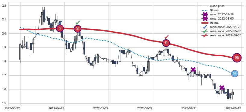 下跌趋势2022-03-22-2022-08-12,均线95确认关键阻力3处